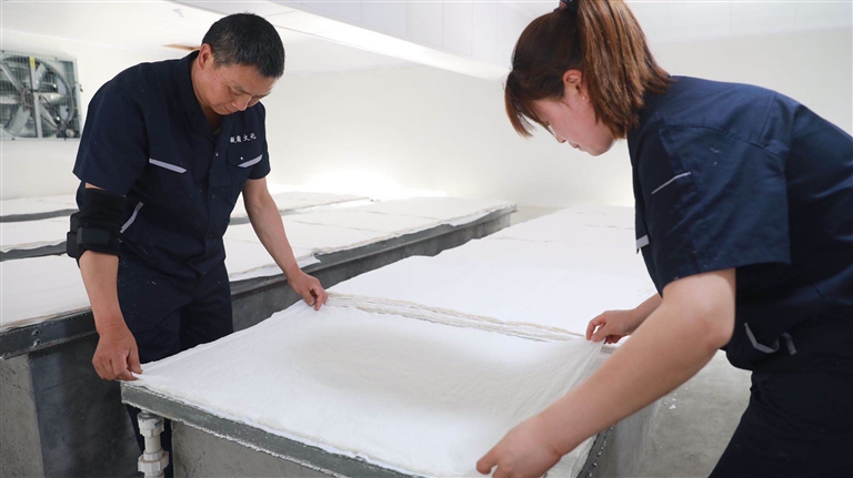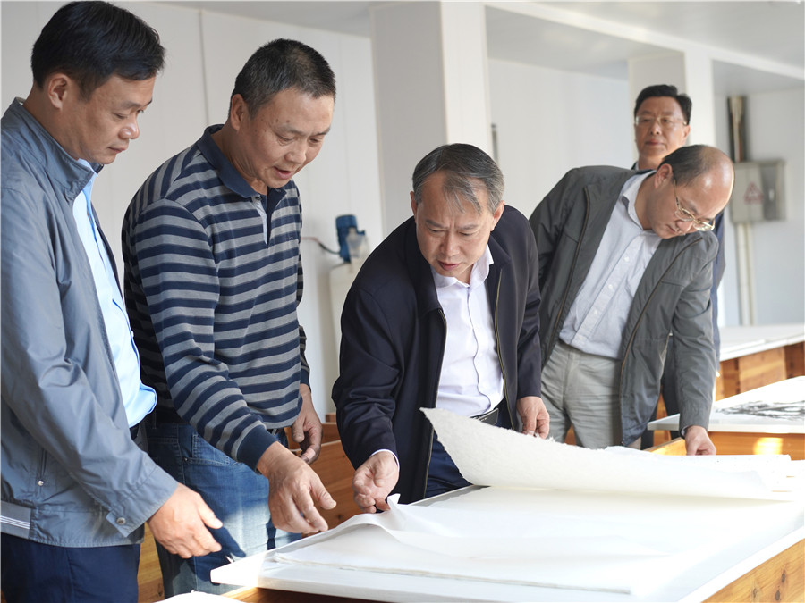 10月9日下午,縣長吳云忠赴海陽鎮(zhèn)凝霜文化發(fā)展公司調(diào)研徽州楮皮紙傳承與發(fā)展工作,縣委常委、海陽鎮(zhèn)黨委書記金學(xué)年,縣委常委、縣政府副縣長程衛(wèi)華參加調(diào)研活動。 吳云忠一行實地察看了徽州楮皮紙生產(chǎn)工藝流程,認(rèn)真聽取企業(yè)負責(zé)人介紹,詳細詢問徽州楮皮紙制作工藝
