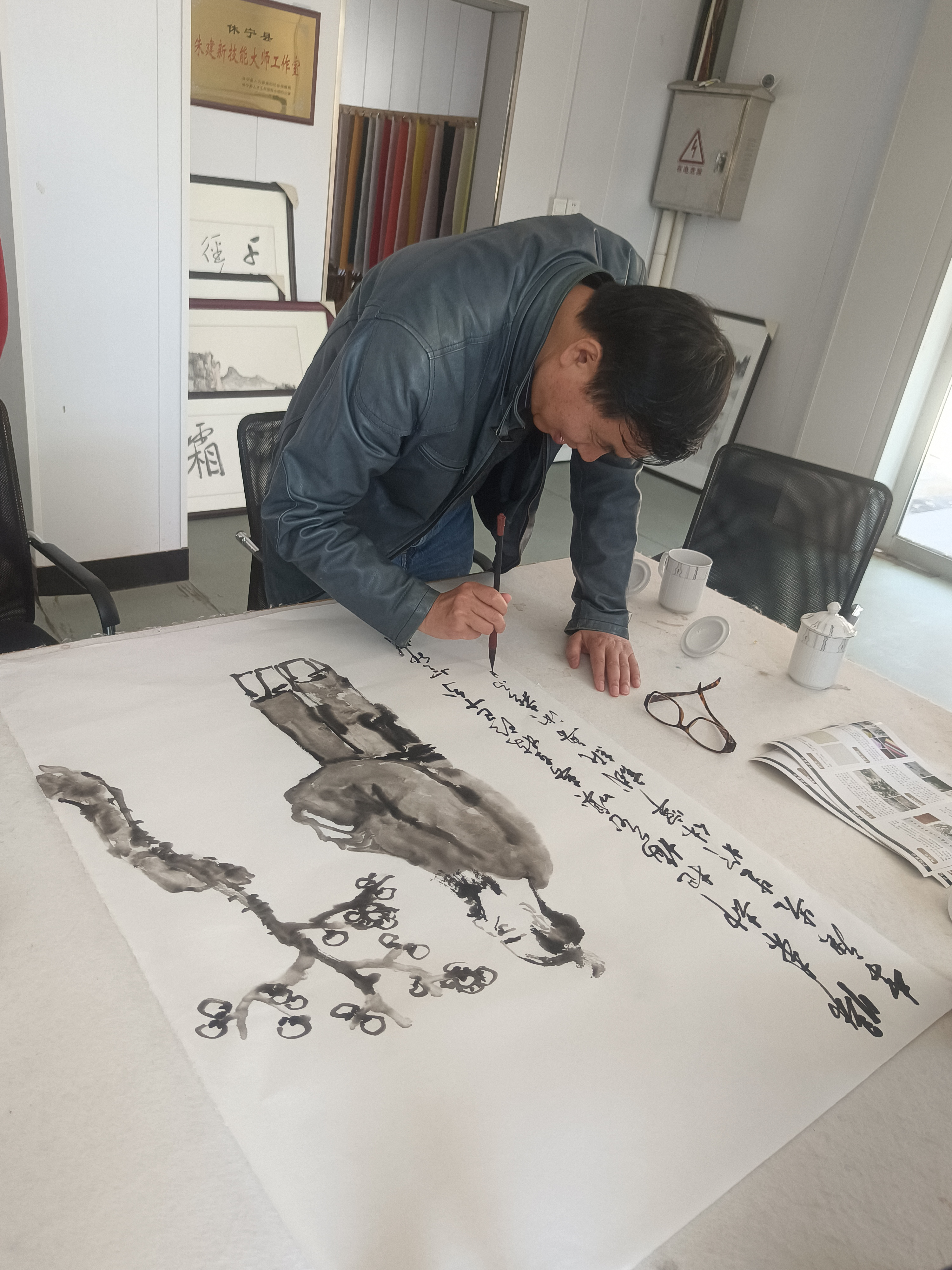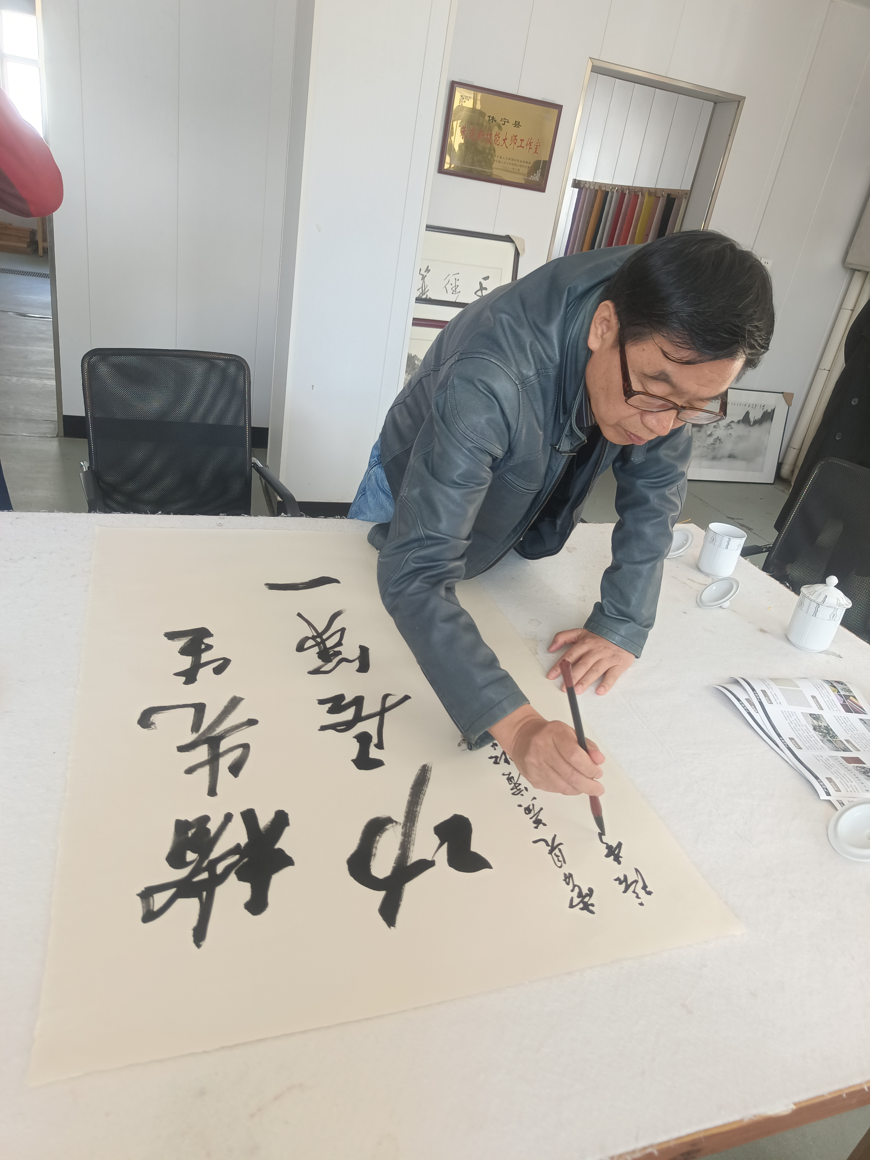 近距離觀摩大師創(chuàng)作,著名畫家李庚老師和著名文化學(xué)者、書法家王魯湘老師抽出寶貴時(shí)間來(lái)公司指導(dǎo)試筆,并為我們留下三幅珍貴墨寶,這是對(duì)我們做徽州皮紙的肯定,也是對(duì)我們的鞭策,使我們更有信心堅(jiān)守敬畏之心,匠人精神,做出更好的徽州皮紙。感謝安徽書法協(xié)會(huì)會(huì)長(zhǎng)王云龍全程陪同